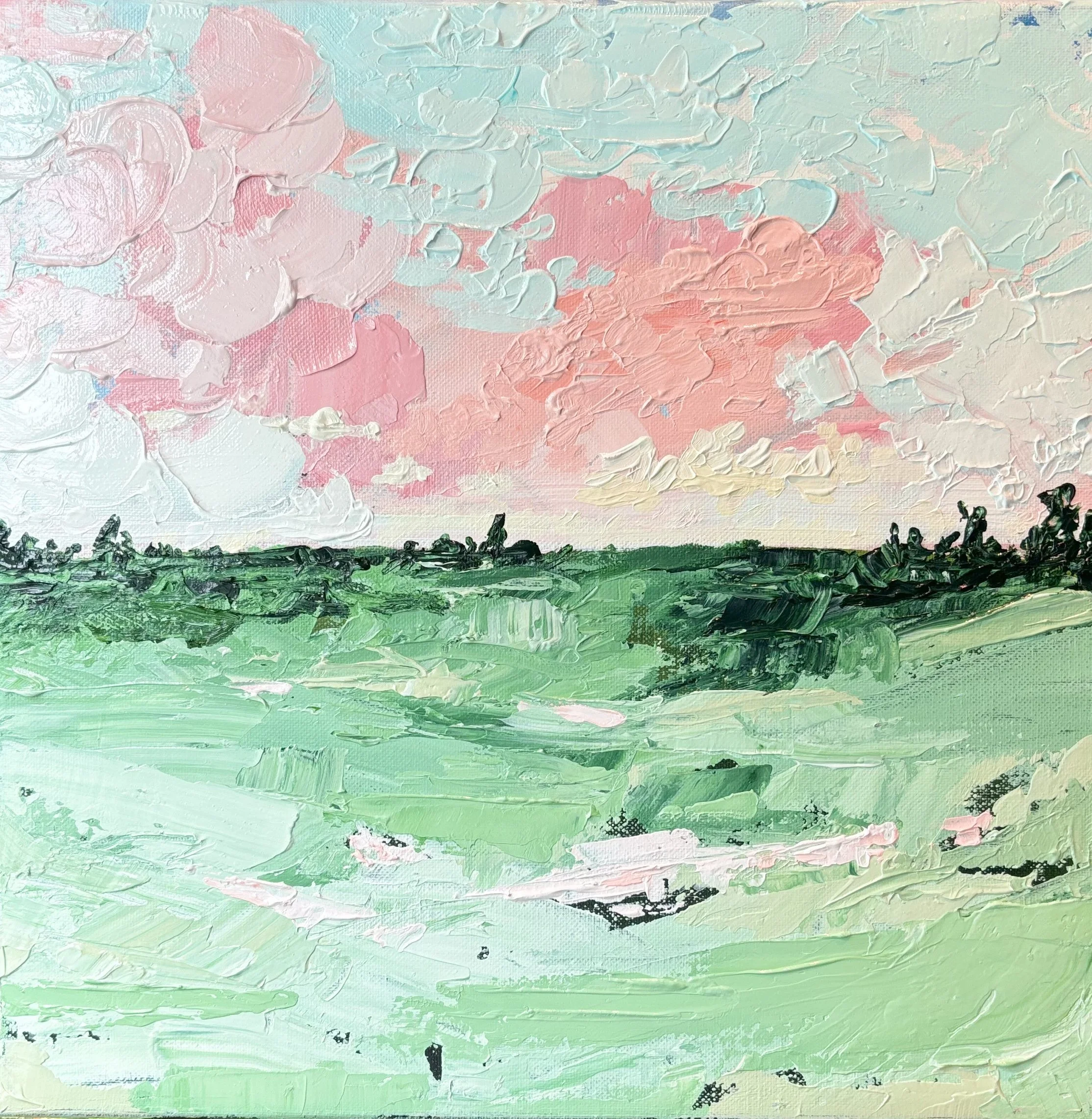 Abstract landscape painting with bright colors depicting a sky, horizon, and body of water. The sky features shades of blue, pink, and orange, while the foreground includes green and pink elements, suggesting grassy and reflective surfaces.